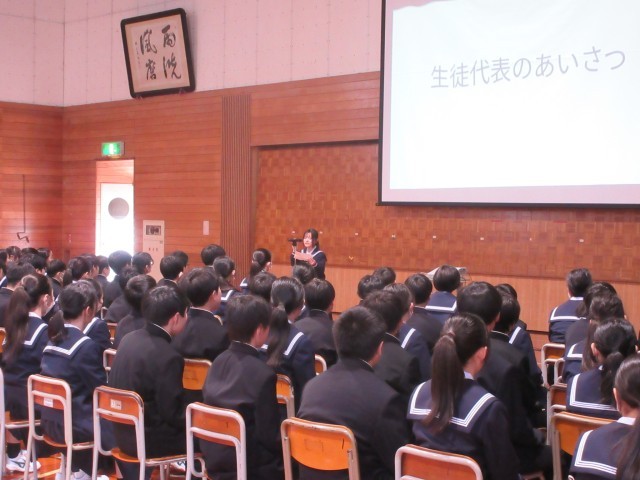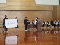生徒会長と新1年生代表の生徒からそれぞれあいさつがあり、全校生徒で藤ノ木中学校伝統の生徒信条も朗読しました。