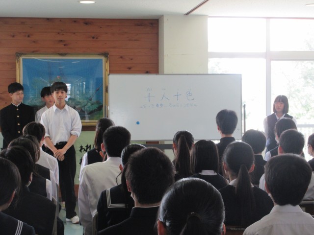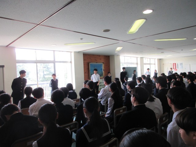 学年集会が行われ、学年生徒会、各クラスの班長の紹介がありました。
