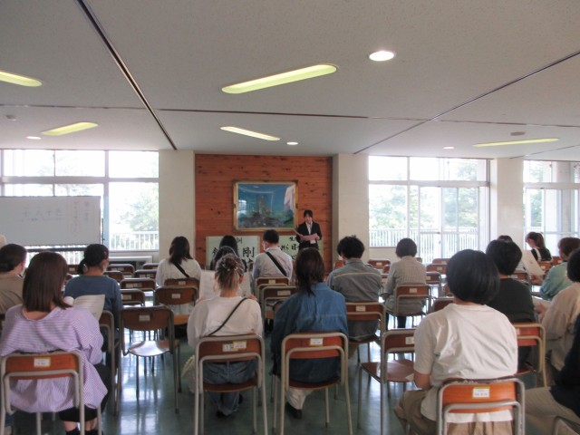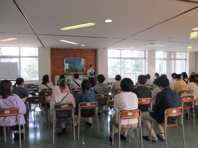 学年担当者の紹介、学年運営方針、学習、生活についての話に加え、「社会に学ぶ『14歳の挑戦』」や修学旅行についての説明が、担当者からありました。