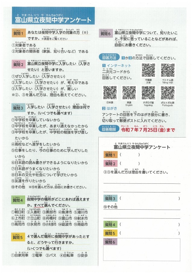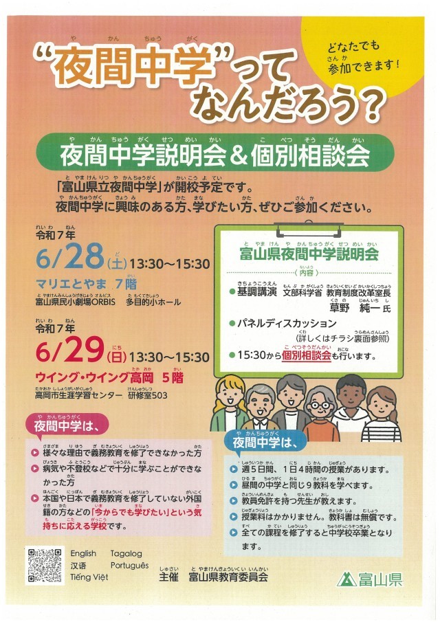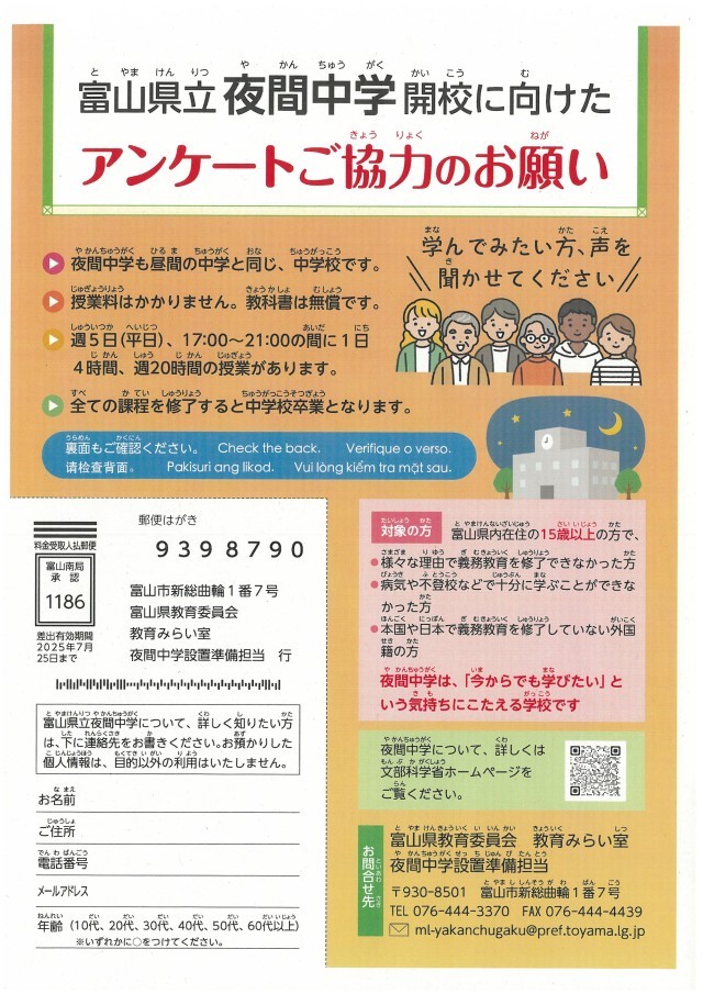 富山県では、県立夜間中学の開校に向けて準備を進めております。入学対象となる、様々な理由で義務教育を十分に受けられなかった 15 歳以上の方々から、一人でも多くお声を聞かせていただくため、周知について皆様のご協力をお願いいたします。お知り合いや職場の方に、ぜひお知らせください。