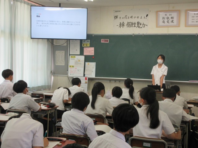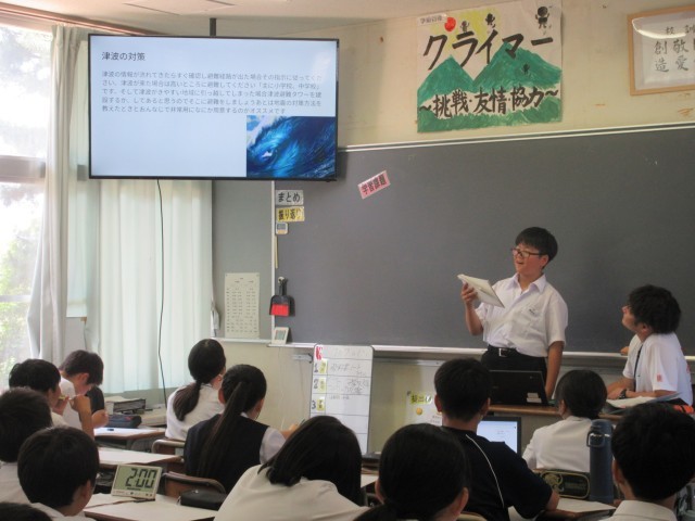 7月7日(月)4・5限目に各自で調べてきた防災についての課題学習の学級発表会がありました。