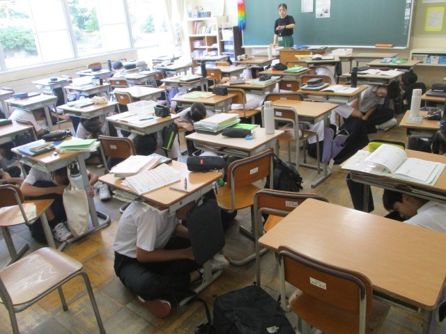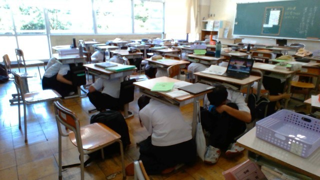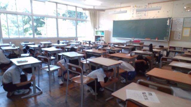 地震発生音の後、「まず低く、頭を守り、動かない」の3つの動作を意識して行いました。