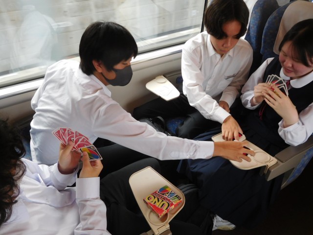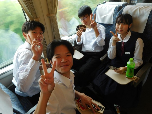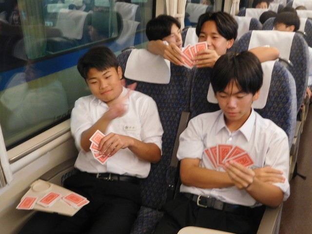 新大阪までの1時間半を思い思いに過ごしています。級友の新しい一面に出会えたかな!?