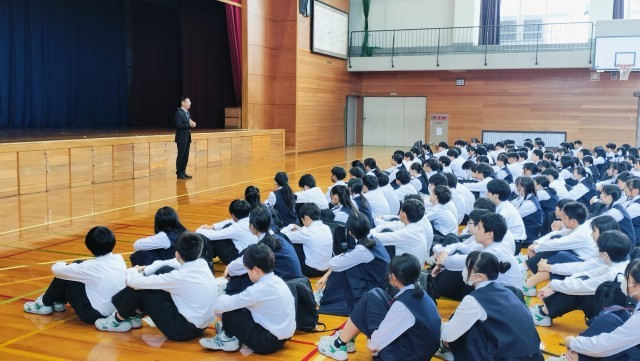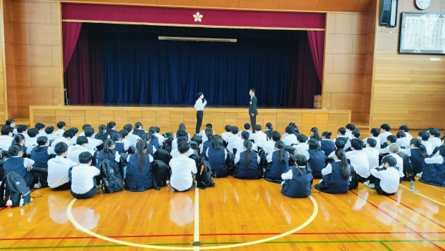 体育館で校外学習の出発式を行いました。生徒代表から校長先生に校外学習での学びについて挨拶を行いました。
