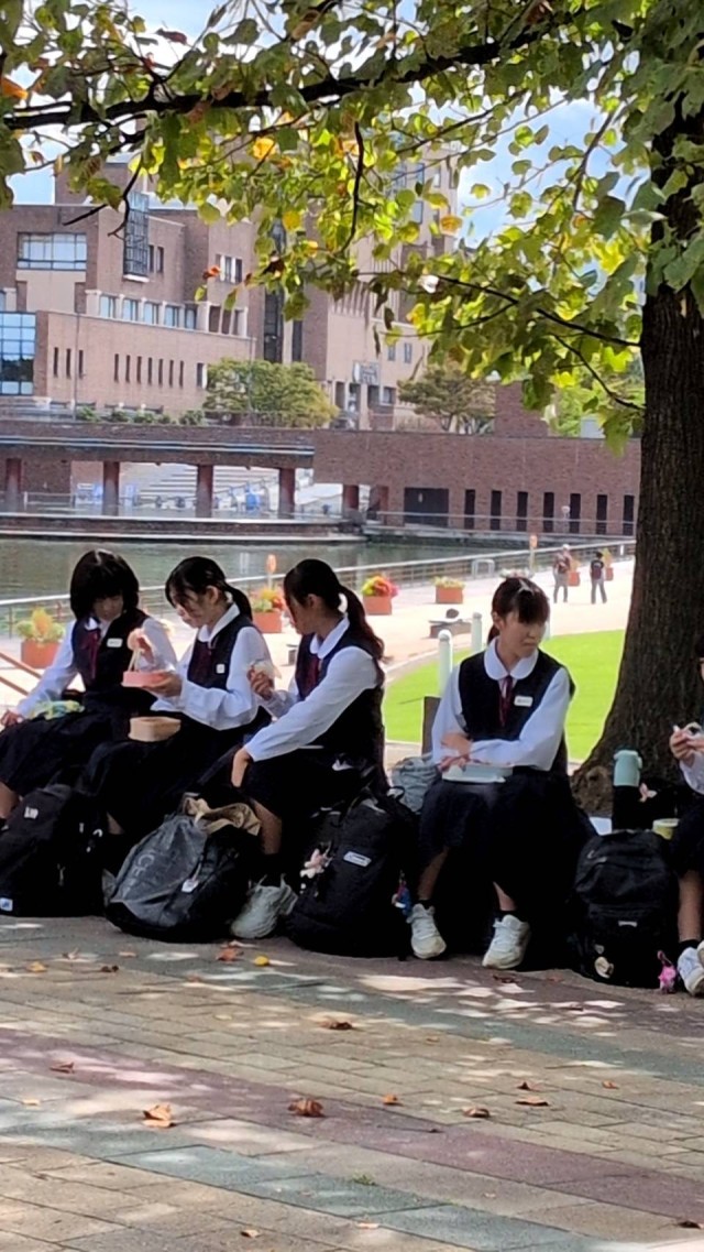 富山市も晴れてきました。午後からの活動に向けて、富岩運河環水公園にて昼食タイムです。