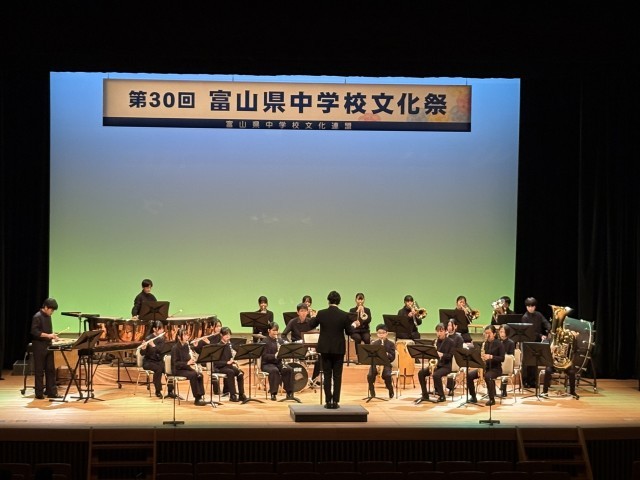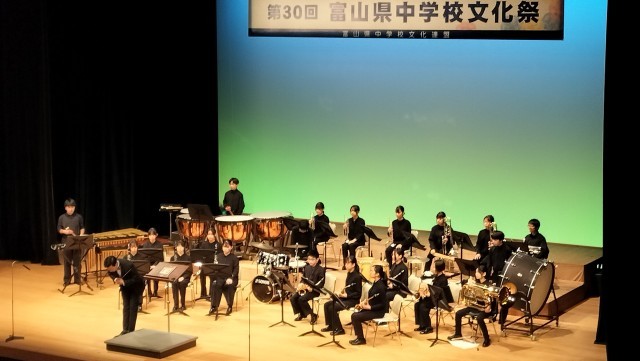 第30回富山県中学校文化祭が富山県民会館で行われました。ステージ発表の音楽部門のトリを本校吹奏楽部が務め、本日が最後の演奏になる3年生を交え、総勢21名による感動的な演奏を披露しました。