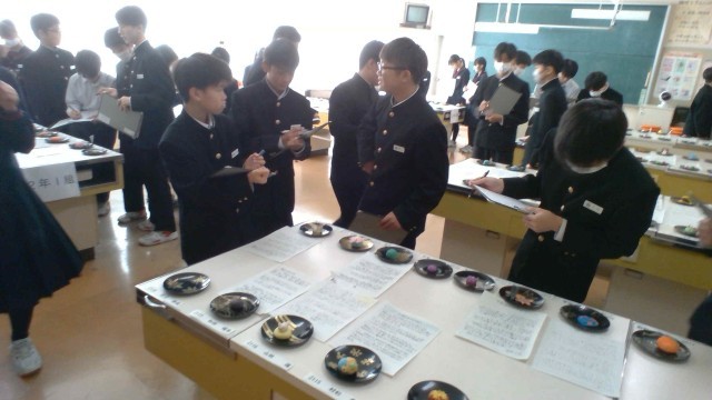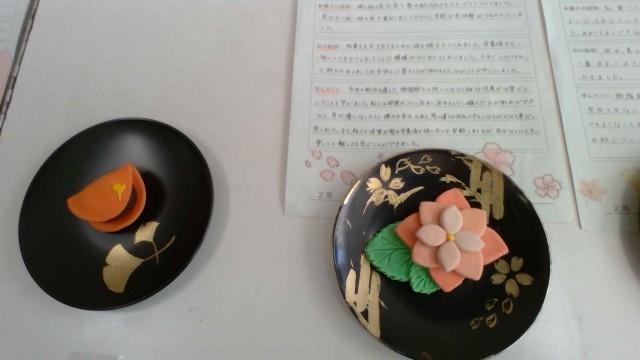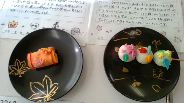 11月6日(木)学園祭です。展示作品を楽しそうに見学し、感想をメモしています。2学年は、美術でアクリル粘土を使って「和菓子」を制作しました。本物みたいでとてもきれいです。