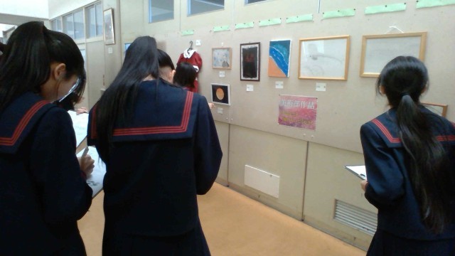 美術室前には、美術部部員の作品が展示されています。才能が光っています。