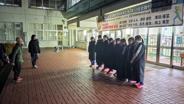 北信越駅伝競走大会に出場した女子駅伝チームが帰着しました。監督やコーチからは、4連覇を逃した悔しさの気持ちを切り替えて、全中に向けて頑張るよう激励しました。選手は、生徒玄関に飾られた応援横断幕を見て元気を取り戻していました。