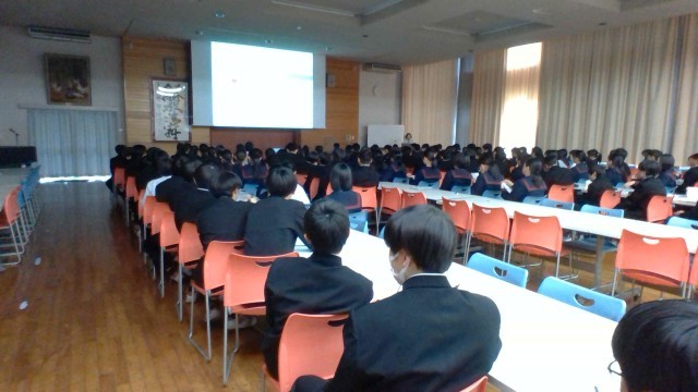 2学年集会の様子です。産婦人科のお医者様が、性に関することについて、丁寧に説明をしてくださいました。事前に動画を見て学習をしてから説明を聴きました。大変真剣に学びました。