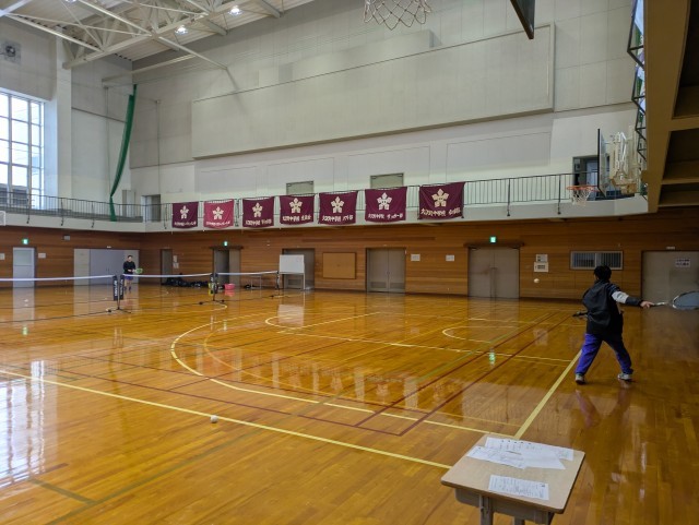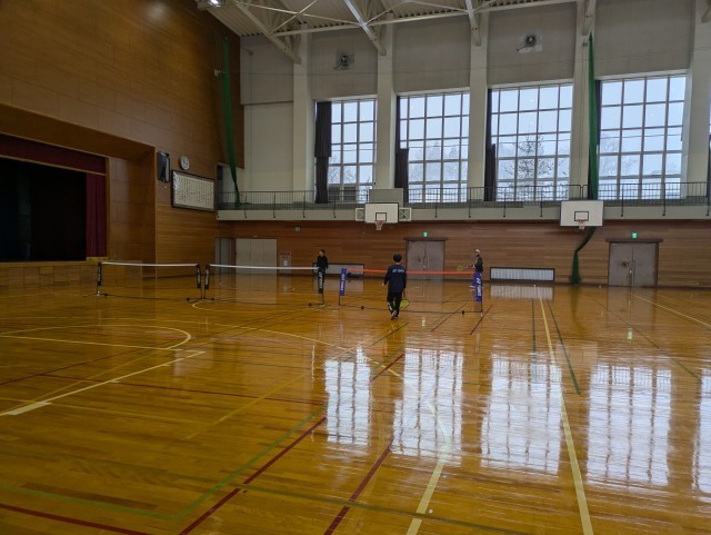 テニスコートにも雪が積もり、本日はトレーニングルームの片付け、ランニング等の体力・筋力トレーニング、体育館でのヒッティングを行いました。