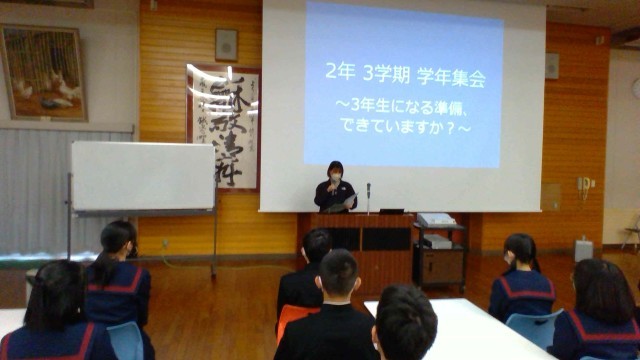2学年の学年集会です。今日の内容は、「3学年になる準備」についてです。昨年11月から「テキスト学習」を行っています。先生方のお話を聴く表情が引き締まっています。