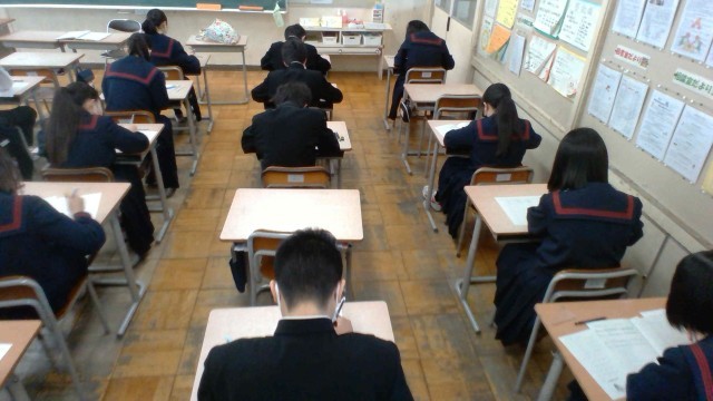 2学年、学年末考査1日目です。本日は、音楽、数学、国語です。落ち着いて問題に取り組んでいます。