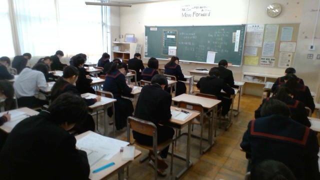 2学年 学年末考査 数学の様子です。図形の問題等に真剣に取り組んでいます。内容が少しずつ難解になってきています。