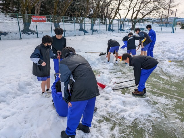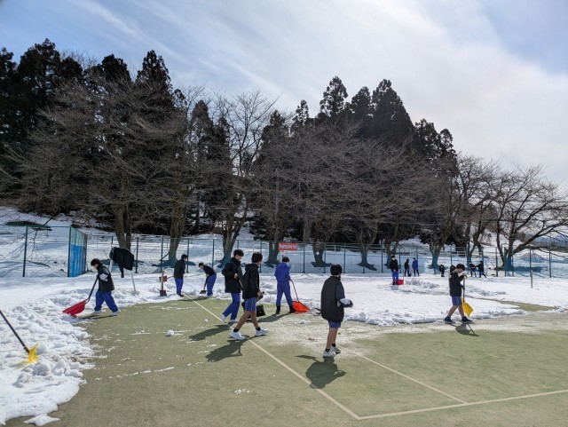 男女ソフトテニス部は、テニスコートの雪かきをしました。