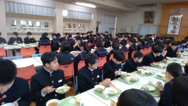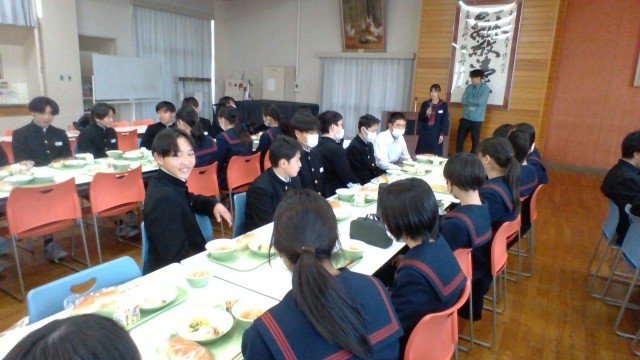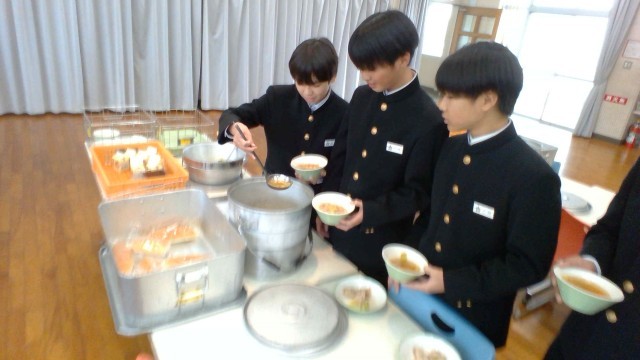 2年ランチルームでの給食です。今日は、コッペパン、ひよこ豆のスープ、鶏肉の塩こうじ蒸し、添野菜、