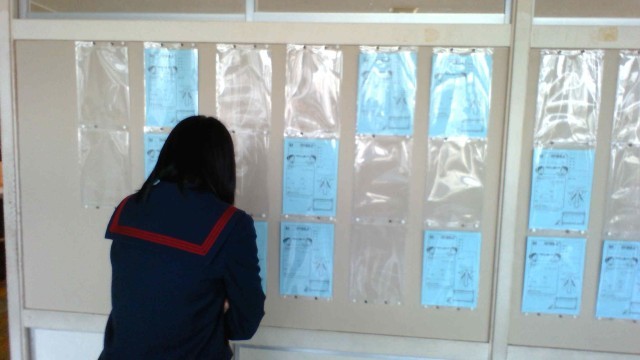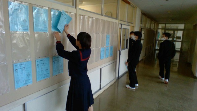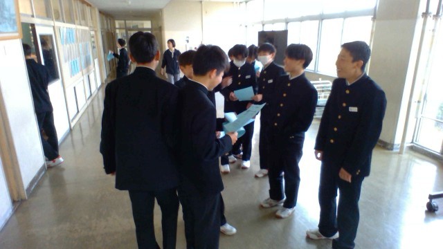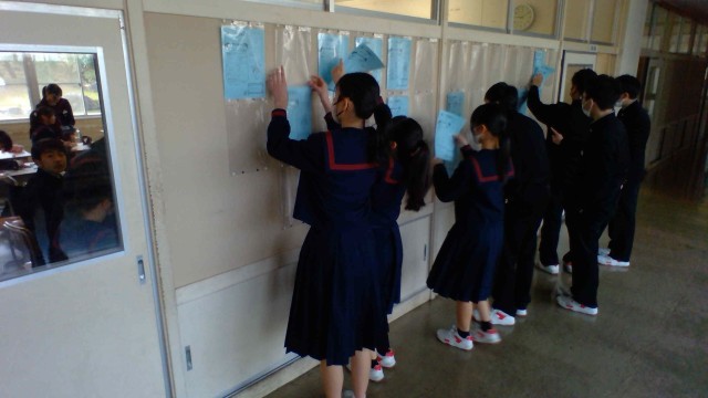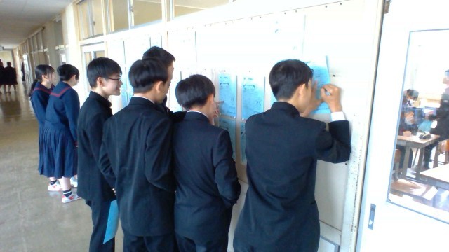 新クラスで自己紹介カードの記入をしました。友達のカードを見たり、カードをもって廊下で話しています。
