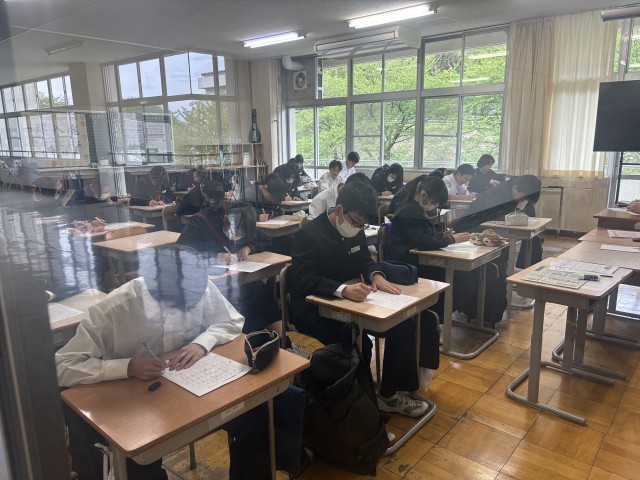 これから毎日、帰りの会終了後、20分間の学習に取り組みます。学習を始める前に、沢中タイムの計画や諸注意について担任の先生から説明がありました。今日は、課題プリントを使って、漢字の学習を行いました。生徒はとても集中して学習に取り組んでいました。