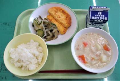 12月最初の給食メニューは、ごはん、白いんげん豆のシチュー、茎わかめサラダ、オムレツ、牛乳 でした。