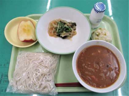 今日のメニューは、ソフト麺のきのこビーフソース、大根サラダ、蒸しパン、りんご、飲むヨーグルト でした。