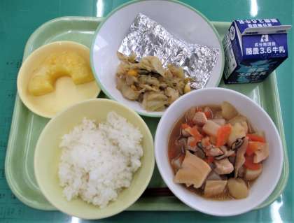 今日のメニューは、ごはん、さばの銀紙焼き、大和煮、チンゲンサイソテー、カットパイン、牛乳 でした。