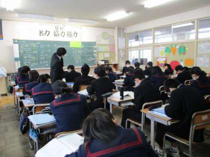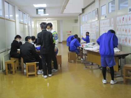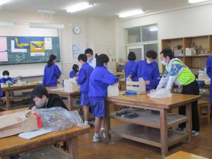 画像上、中:11H技術 木材加工 作品が仕上がってきています。密を防ぐために廊下も活用しています。