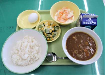 今日のメニューは、麦ごはん、カレーライス、ゆで卵、カラフルサラダ、フルーツヨーグルト、牛乳 でした。