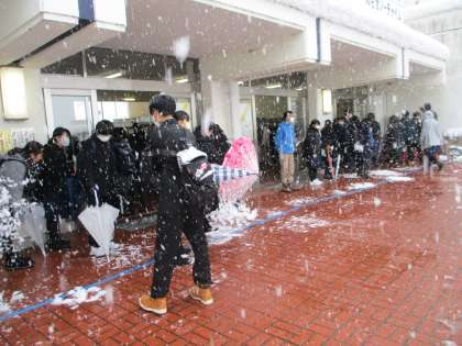 積雪は45cm、気温−0.5度で、足下が悪い中、生徒が登校してきてくれました。一時的に強い雪が降り、傘も上着もリュックも雪まみれの生徒もいました。