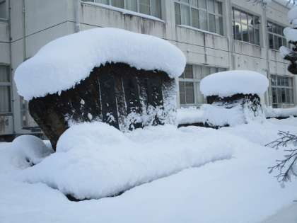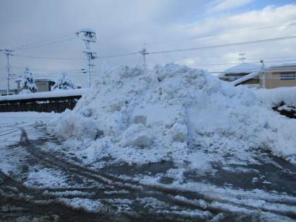 今朝の積雪の様子です。除雪した雪が高い山になりました。