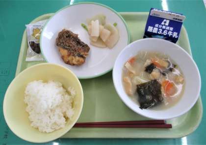 今日のメニューは、ごはん、具だくさん汁、かぶの色どり、魚のごまだれかけ、黒糖大豆、牛乳 でした。