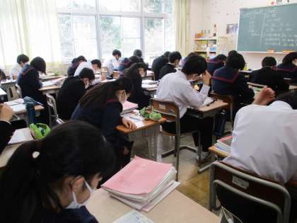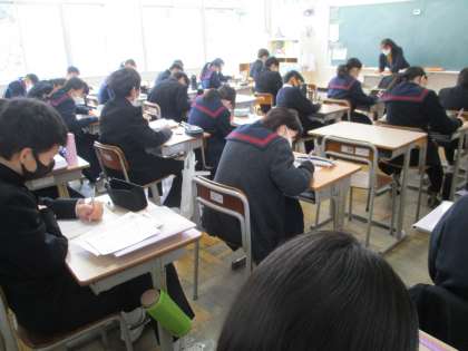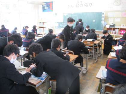 画像上:12H数学 円とおうぎ形のプリントを教え合いながら進めていました