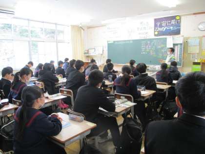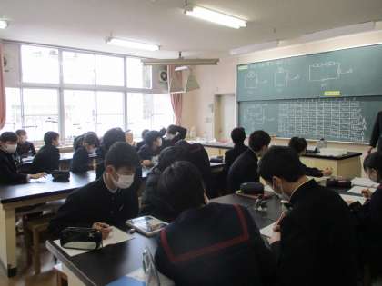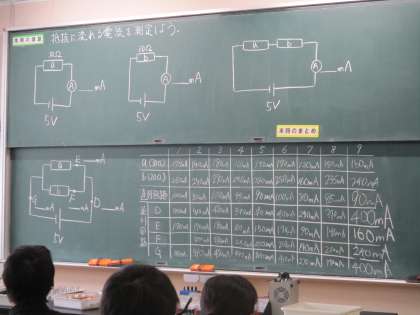 画像上、中:21H理科 抵抗に流れる電流を測定しよう 各グループの測定結果が黒板に一覧になっていました