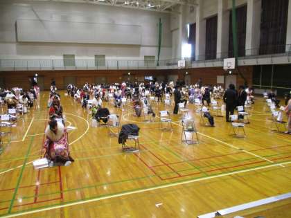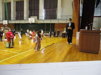昨年は大沢野生涯学習センターのホールで行われましたが、新型コロナウイルス感染症対策のため、広い場所が必要だということで、ほとんどの新成人の出身校である本校の体育館で、画像でわかるとおり、座席の間隔を十分にあけて行いました。