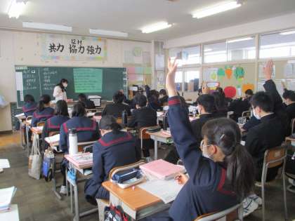 画像下:12H英語 手を挙げて、問題に答え、シールを貼ってもらっています