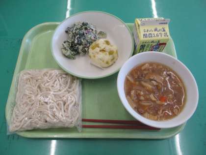 今日のメニューは、ソフト麺の五目あんかけ、ビーンズサラダ、蒸しパン、牛乳 でした。
