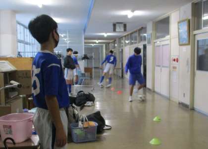 画像は、上:3年教室前でボールタッチの練習をしているサッカー部。中:保健室前で体幹トレーニングをしている陸上競技部女子。下:スクリーンを使った2対2の練習をしている男子バスケットボール部。