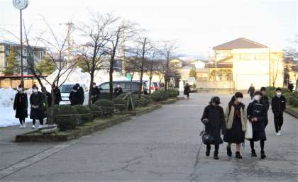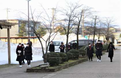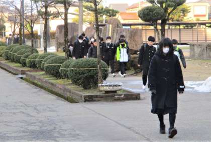 登校時間の気温は3度程でした。青空が見えますが、8時頃は生徒玄関前には朝日が当たらないので、少し暗いです。生徒の上着(コート類)には、完全防寒ではない上着も見られ、足下がズックの生徒もいます。
