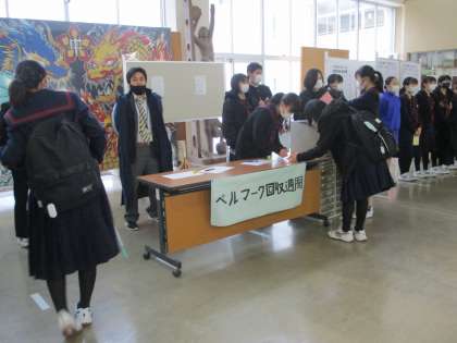 今朝も、朝早くから生徒会執行部や実践部が回収運動を行いました。書き損じはがきやベルマークもたくさん集まっています。生徒の皆さん、協力ありがとうございます。