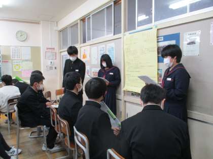 各クラスで3か所の発表場所で調べた生徒が説明し、それをメモしながら聞きました。