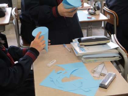 画像中、下:14H数学 立体(円錐)を作っていました