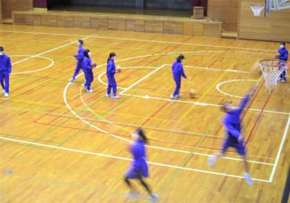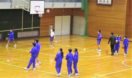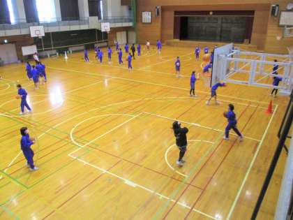 画像は、22Hの保健体育でバスケットボールのレイアップシュートを練習している様子です。本校には、6か所バスケットゴールがあるので、効率的に練習ができます。