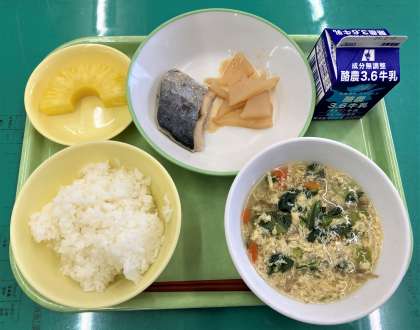 今日のメニューは、ごはん、さわらの塩焼き、あんばやし、中華かきたま汁、カットパイン、牛乳 でした。