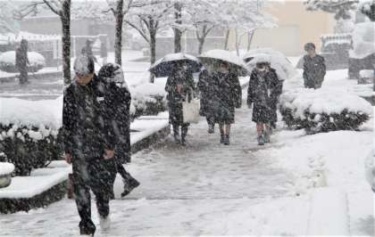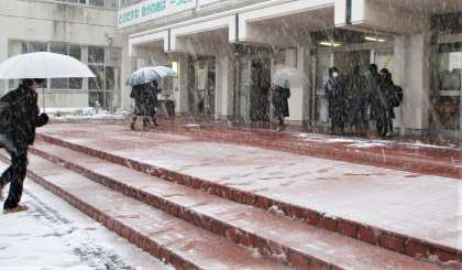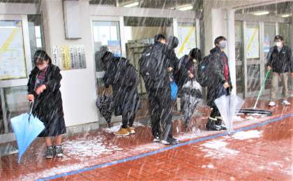 今朝は、登校時間に時折強く細かい雪が降り、登校してきた生徒の傘には、たくさんの雪が積もっていました。地面には5cm程の雪が積もった状態でしたが、生徒は元気よく登校してきてくれました。