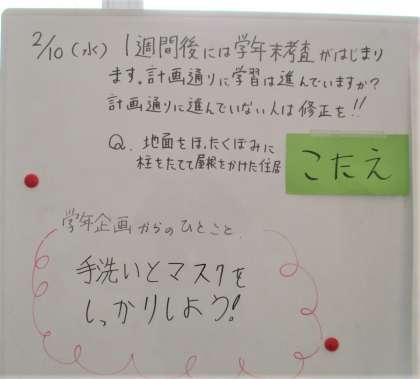 1年生のホワイトボードです。学年末テストに向けて頑張ってください。