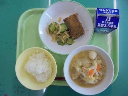 今日のメニューは、ごはん、大漁鍋、揚げ出し豆腐のごまだれかけ、華風あえ、牛乳 でした。