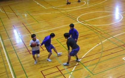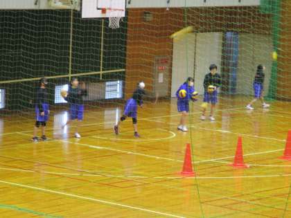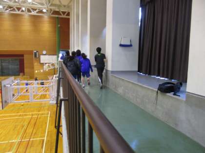 体育館では、多くの部活動がランニング走路を走ってトレーニングをしていました。フロアでは、バスケットボール部とバレーボール部が活動していました。