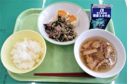 今日のメニューは、ごはん、にんじんシュウマイ、レバニラ炒め、きのこ汁、牛乳 でした。