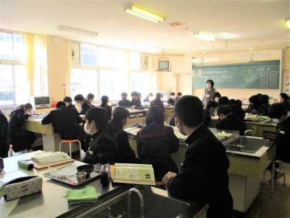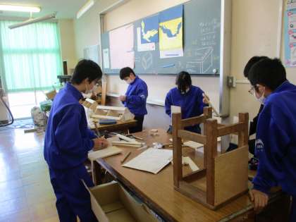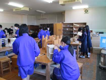 画像中、下:12H技術 木材加工:完成した生徒もいますが、まだ接合作業を行っている生徒もいます。