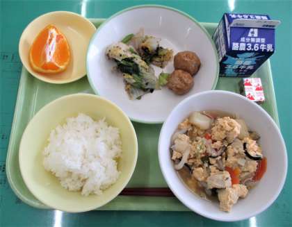 今日のメニューは、ごはん、ポケットチーズ、肉団子のあんからめ、梅肉あえ、白ねぎと高野豆腐の卵とじ、デコポン、牛乳 でした。