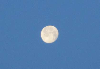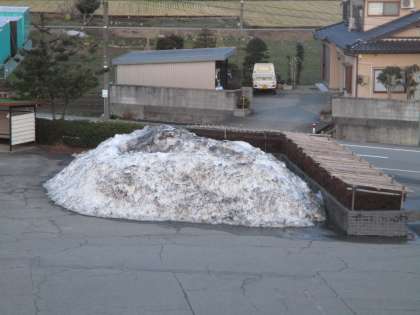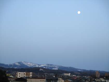 今朝もよい天気でした。朝の満月と駐車場の雪山です。